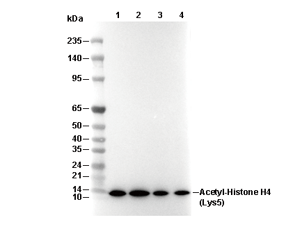 Acetyl-Histone H4 (Lys5) Antibody [N10C10] 仅识别 Lys5 位点乙酰化的内源性 Histone H4 蛋白水平。