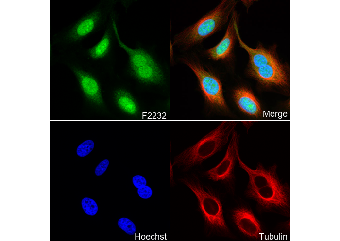 • Immunofluorescent analysis of Hela cells using F2232 (green, 1:100), Hoechst (blue) and tubulin (Red).