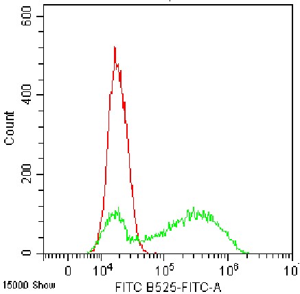 • Staining of fixed/permeabilized HEK-293F cells transfected with pLV3-CMV-ABCG2(human)-3×FLAG-Puro plasmid using AF488 Anti-BCRP1 Antibody (Clone: 5D3) (Product No.: H2994) (green, red is blank control). Analyzed data are derived from total cells.