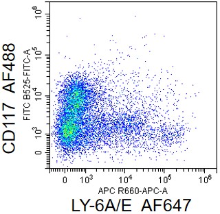 • Staining of bone marrow cells from C57BL/6 mice using AF647 Anti-Ly-6A/E Antibody and AF488 Anti-CD117/c-Kit Antibody (Clone: 2B8) (Product No.: G4059). Analyzed data are derived from total live cells.