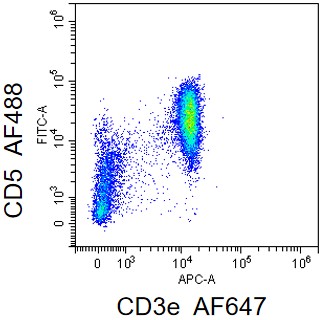 • Staining of splenic lymphocytes from C57BL/6 mice using AF647 Anti-CD3e Antibody and AF488 Anti-CD5 Antibody (Clone: 53-7.3) (Product No.: G3489). Analyzed data are derived from total live cells.