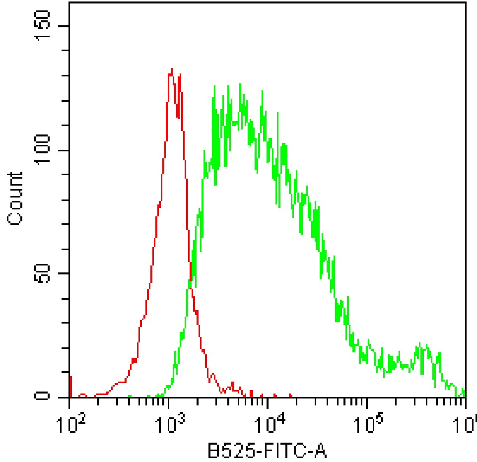• Staining phosphorylated/permeabilized Jurkat cells with AF488 EGF Receptor Antibody (Clone: K22M8) (Product Number: H4209) (green, red is unstained control). Analysis was performed on total cells.