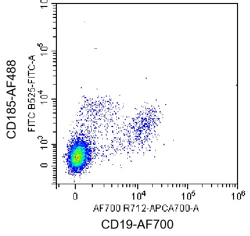 • Staining of normal human peripheral blood mononuclear cells (PBMCs) using AF700 Anti-CD19 Antibody and AF488 Anti-Human CD185 Antibody (Clone: RF8B2) (Product No.: H1239). Analyzed data are derived from lymphocytes.