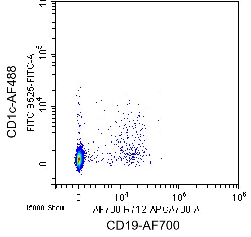 • Staining of normal human peripheral blood mononuclear cells (PBMCs) using AF700 Anti-CD19 Antibody and AF488 Anti-Human CD1c Antibody (Clone: L161) (Product No.: H1599). Analyzed data are derived from lymphocytes.