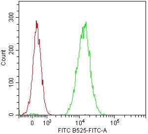 • Staining of platelet-enriched normal human peripheral blood using AF488 Anti-Human CD41a Antibody (Clone: HIP8) (Product No.: H0894) (green, red is blank control). During acquisition, the threshold in the acquisition parameters needs to be reduced and a logarithmic axis should be used to better distinguish platelet cells. Analyzed data are derived from platelet cells.