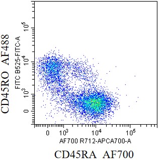 • Staining of normal human peripheral blood mononuclear cells (PBMCs) using AF700 Anti-CD45RA Antibody and AF488 Anti-Human CD45RO Antibody (Clone: UCHL1) (Product No.: H4014). Analyzed data are derived from lymphocytes.