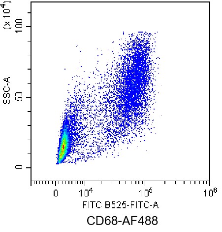 • Staining of fixed/permeabilized normal human peripheral blood mononuclear cells (PBMCs) using AF488 Anti-Human CD68 Antibody (Clone: Y1/82A) (Product No.: H0519). Analyzed data are derived from monocytes.