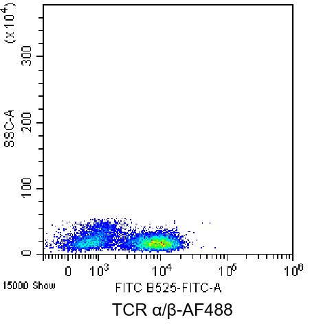 • Staining of normal human peripheral blood mononuclear cells (PBMCs) using AF488 Anti-Human TCR α/β Antibody (Clone: IP26) (Product No.: H1494). Analyzed data are derived from lymphocytes.