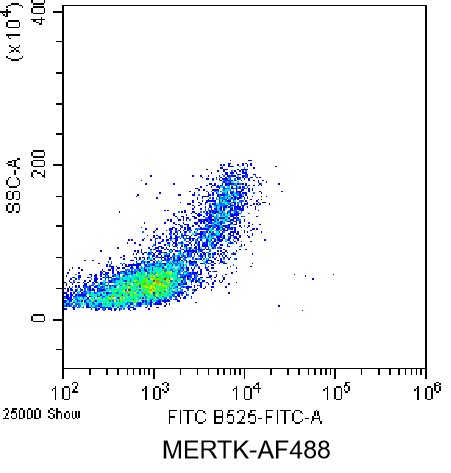 • Staining of ascites cells from C57BL/6 mice using AF488 Anti-MERTK Antibody (Clone: DS5MMER1) (Product No.: G1974). Analyzed data are derived from live lymphocytes.