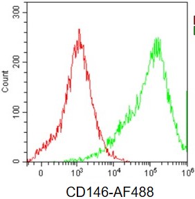 • Staining of bEnd.3 cells using AF488 Anti-Mouse CD146 Antibody (Clone: ME-9F1) (Product No.: G0984) (green, red is blank control). Analyzed data are derived from live lymphocytes.