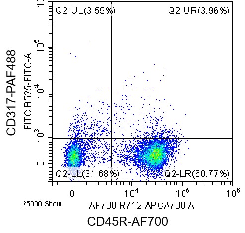 • Staining of C57BL/6 mouse splenic lymphocytes using AF700 CD45R Antibody and AF488 Mouse CD317 Antibody (Clone: 927) (Catalog Number: G1419). Analysis data derived from live lymphocytes.