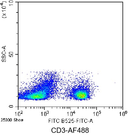 • Staining of splenic lymphocytes from C57BL/6 mice using AF488 Anti-Mouse CD3epsilon Antibody (Clone: 145-2C11) (Product No.: G4164). Analyzed data are derived from live lymphocytes.