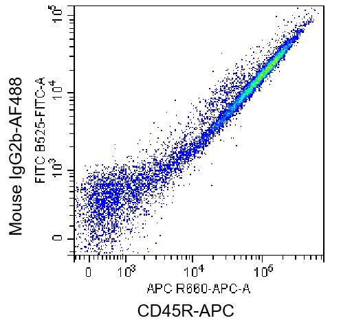 • Staining of normal human peripheral blood mononuclear cells (PBMCs) using AF488 Mouse IgG2b Antibody (Clone: RMG2b-1) (Selleck Cat#: G3189) and APC CD45RA Antibody. Analyzed data are derived from lymphocytes.