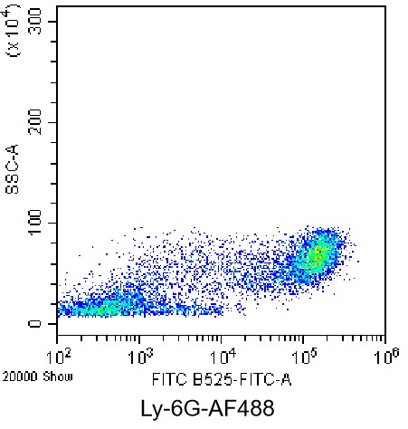 • Staining of bone marrow cells from C57BL/6 mice using AF488 Anti-Mouse Ly6G Antibody (Clone: 1A8) (Product No.: G4434). Analyzed data are derived from live lymphocytes.