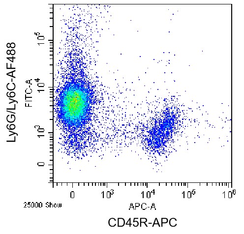 • Staining of bone marrow cells from C57BL/6 mice using APC Anti-CD45R Antibody and AF488 Anti-Mouse Ly6G/Ly6C Antibody (Clone: RB6-8C5) (Product No.: G4344). Analyzed data are derived from live cells.