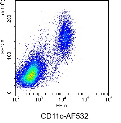 • Staining of normal human peripheral blood mononuclear cells (PBMCs) using AF532 Anti-Human CD11c Antibody (Clone: 3.9) (Product No.: H0149). Analyzed data are derived from live cells.