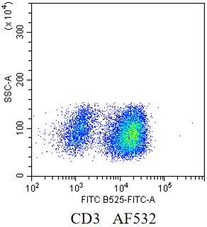 • Staining of normal human peripheral blood mononuclear cells (PBMCs) using AF532 Anti-Human CD3 Antibody (Clone: OKT-3) (Product No.: H4289). Analyzed data are derived from lymphocytes.