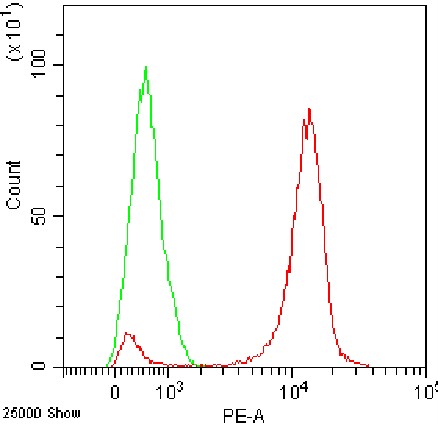• Staining of normal human peripheral blood mononuclear cells (PBMCs) using AF532 Anti-Human CD45 Antibody (Clone: HI30) (Product No.: H0104) (red, green is unstained control). Analyzed data are derived from lymphocytes.