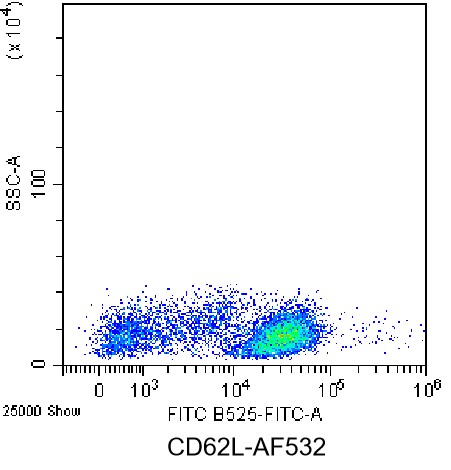 • Staining of normal human peripheral blood mononuclear cells (PBMCs) using AF532 Human CD62L Antibody (Clone: DREG-56) (Catalog Number: H02997). Analysis data derived from lymphocytes.