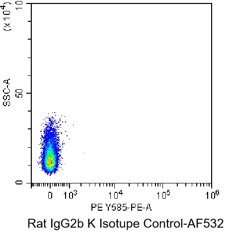 • Staining of splenic lymphocytes from C57BL/6 mice using AF532 Anti-Rat IgG2b kappa Isotype Control Antibody (Clone: eB149/10H5) (Product No.: G0899). Analyzed data are derived from total cells.