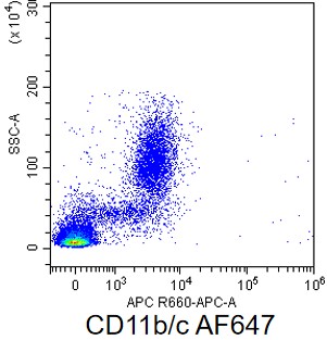 • Staining of bone marrow cells from SD rats using AF647 Anti-CD11b+CD11c Antibody (Clone: OX42) (Product No.: G2082). Analyzed data are derived from lymphocytes.