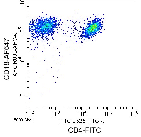 • Staining of normal human peripheral blood mononuclear cells (PBMCs) using FITC Anti-CD4 Antibody and AF647 Anti-CD18 Antibody (Clone: YFC118.3) (Product No.: H1302). Analyzed data are derived from monocytes.