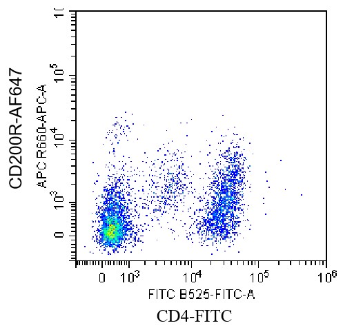 • Staining of normal human peripheral blood mononuclear cells (PBMCs) using AF647 CD200R Antibody (Clone: OX108) (Selleck Cat#: H2892) and FITC CD4 Antibody. Analyzed data are derived from lymphocytes.