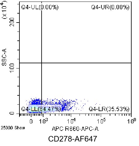 • Staining of mouse splenocytes stimulated with Concanavalin A for 2 days using AF647 Anti-CD278 Antibody (Clone: C398.4A) (Product No.: G1107). Analyzed data are derived from total cells.