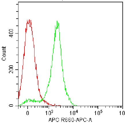 • Staining of C57BL/6 mouse splenic lymphocytes (green) using AF647 CD45.2 Antibody (Clone: 104) (Catalog Number: G0312) and blank control (red). Analysis data derived from total live cells.