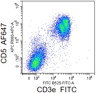 • Staining of splenic lymphocytes from C57BL/6 mice using FITC Anti-CD3e Antibody and AF647 Anti-CD5 Antibody (Clone: 53-7.3) (Product No.: G3492). Analyzed data are derived from total live cells.