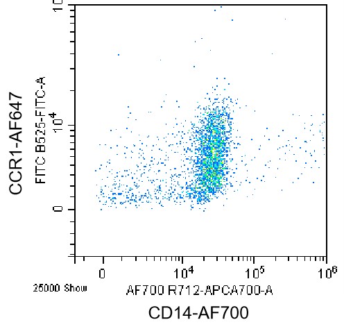 • Staining of normal human peripheral blood mononuclear cells (PBMCs) using AF647 Human CCR1 Antibody (Clone: 53504) (Selleck Cat#: H1872) and AF700 CD14 Antibody. Analyzed data are derived from monocytes.