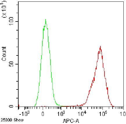 • Staining of Jurkat cell line cells using AF647 Anti-Human CD107a Antibody (Clone: H4A3) (Product No.: H0462) (Red, Green: Blank Control). Analyzed data are derived from live cells.