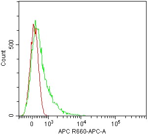 • Staining of HEK-293F cell line cells transfected with pEnCMV-TNFRSF9(human)-3×FLAG-WPRE-SV40-Neo plasmid and permeabilized using fixation/permeabilization buffer using AF647 Anti-Human CD137 Antibody (Clone: 4B4-1) (Product No.: H3807) (Green, red is blank cells). Analyzed data are derived from total cells.