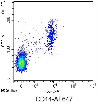 • Staining of normal human peripheral blood mononuclear cells (PBMCs) using AF647 Anti-Human CD14 Antibody (Clone: M5E2) (Product No.: H0192). Analyzed data are derived from live cells.