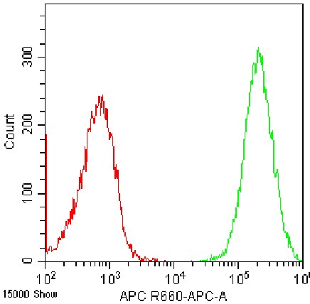 • Staining of HUVECs cell line cells using AF647 Anti-Human CD144/VE-cadherin Antibody (Clone: 55-7H1) (Product No.: H1692) (green, red is blank control). Analyzed data are derived from live cells.