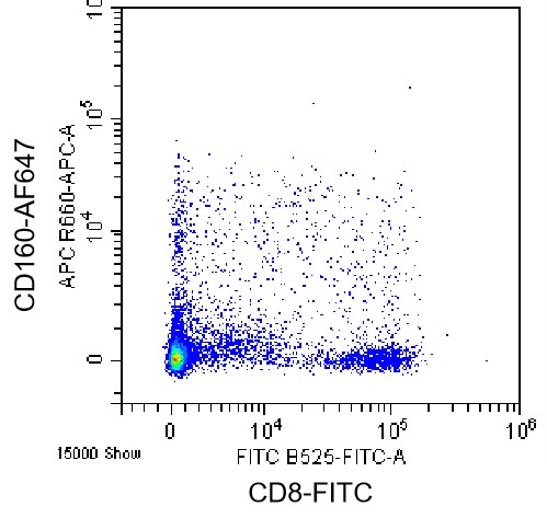 • Staining of normal human peripheral blood mononuclear cells (PBMCs) using FITC CD8a Antibody and AF647 Human CD160 Antibody (Clone: BY55) (Catalog Number: H2142). Analysis data derived from lymphocytes.
