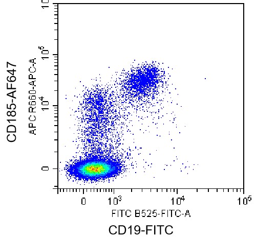 • Staining of normal human peripheral blood mononuclear cells (PBMCs) using FITC CD19 Antibody and AF647 Human CD185 Antibody (Clone: RF8B2) (Catalog Number: H1242). Analysis data derived from lymphocytes.