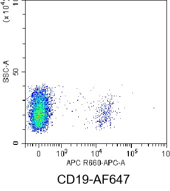 • Staining of normal human peripheral blood mononuclear cells (PBMCs) using AF647 Anti-Human CD19 Antibody (Clone: LT19) (Product No.: H0027). Analyzed data are derived from lymphocytes.