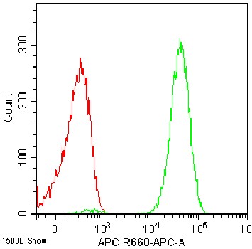 • Staining of MOLT-4 cell line cells using AF647 Anti-Human CD1a Antibody (Clone: HI149) (Product No.: H1587) (green, red is blank control). Analyzed data are derived from live cells.