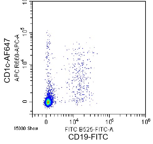 • Staining of normal human peripheral blood mononuclear cells (PBMCs) using FITC Anti-CD19 Antibody and AF647 Anti-Human CD1c Antibody (Clone: L161) (Product No.: H1602). Analyzed data are derived from lymphocytes.