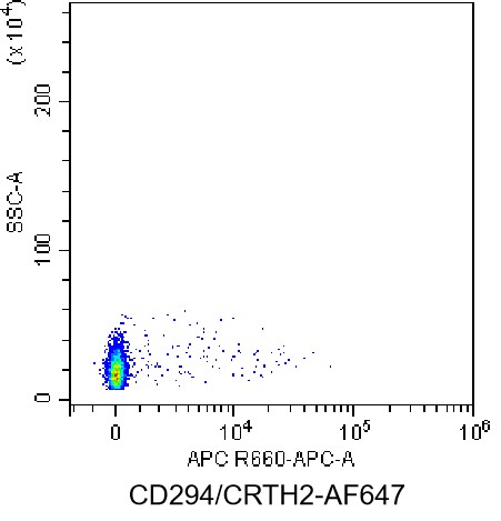 • Staining of normal human peripheral blood mononuclear cells (PBMCs) using FITC Anti-CD4 Antibody and AF647 Anti-Human CD294/CRTH2 Antibody (Clone: BM16) (Product No.: H1767). Analyzed data are derived from CD4+ cells.