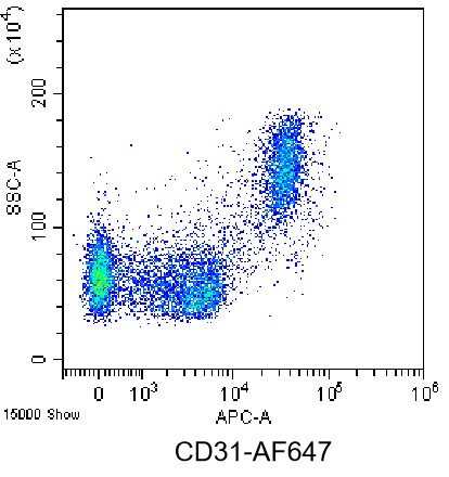 • Staining of normal human peripheral blood mononuclear cells (PBMCs) using AF647 Anti-Human CD31 Antibody (Clone: WM59) (Product No.: H0237). Analyzed data are derived from live cells.
