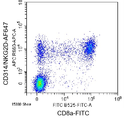 • Staining of normal human peripheral blood mononuclear cells (PBMCs) using FITC Anti-CD8a Antibody and AF647 Anti-Human CD314/NKG2D Antibody (Clone: 1D11) (Product No.: H1407). Analyzed data are derived from lymphocytes.