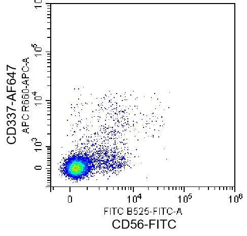 • Staining of normal human peripheral blood mononuclear cells (PBMCs) using FITC Anti-CD56 Antibody and AF647 Anti-Human CD337/NKp30 Antibody (Clone: P30-15) (Product No.: H1782). Analyzed data are derived from monocytes.