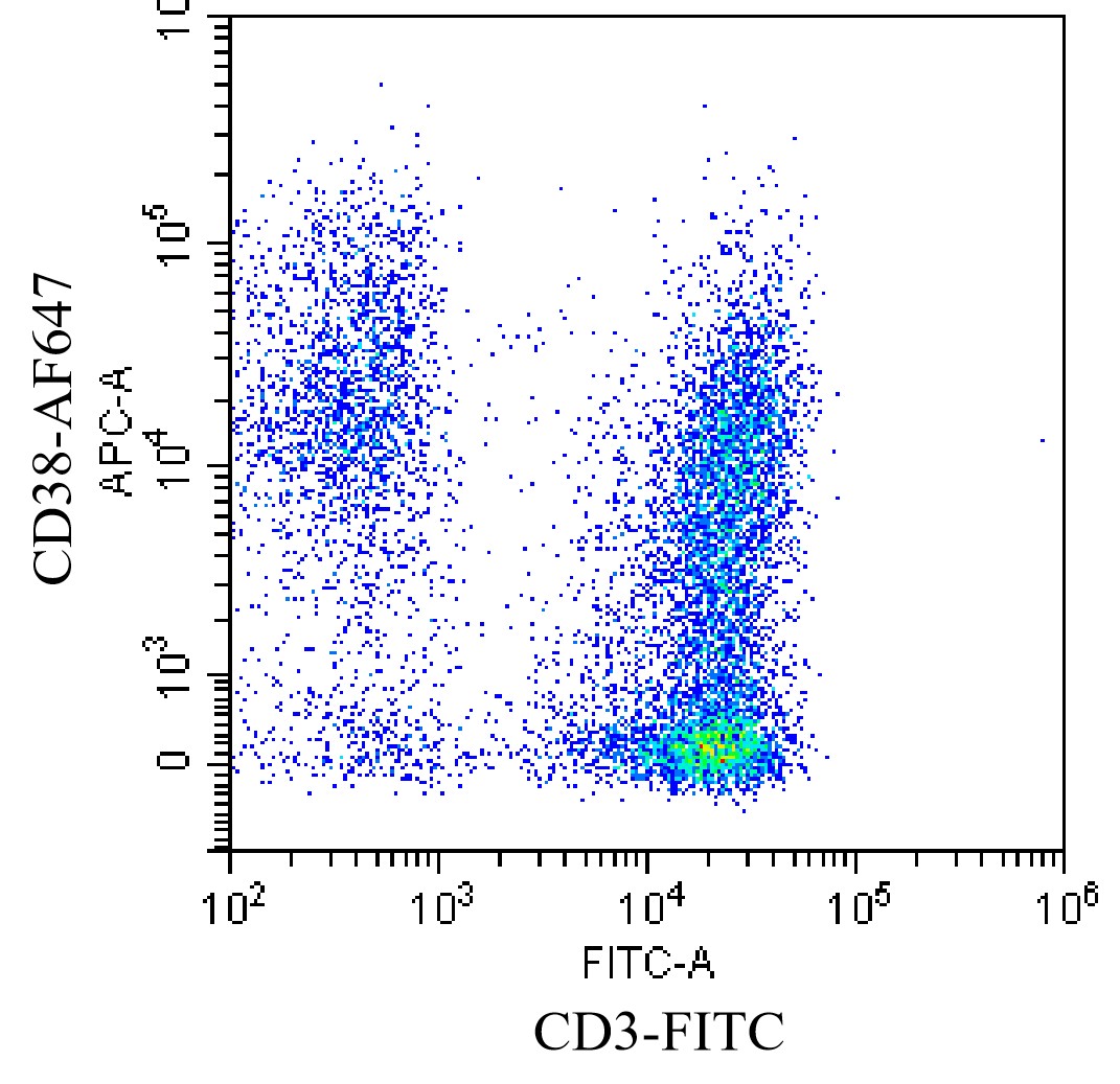 • Staining normal human peripheral blood mononuclear cells (PBMCs) with AF647 Human CD38 Antibody (Clone: HIT2) (Product Number: H0867) and FITC CD3 Antibody. Analysis was performed on lymphocytes.