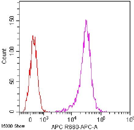 • Staining of normal human peripheral blood mononuclear cells (PBMCs) using AF647 Anti-Human CD54 Antibody (Clone: HA58) (Product No.: H1257) (magenta, red is blank control). Analyzed data are derived from lymphocytes.