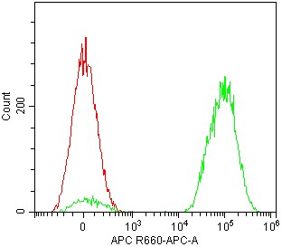 • Staining of platelets enriched from normal human peripheral blood using AF647 Anti-Human CD61 Antibody (Clone: VI-PL2) (Product No.: H3972) (Green, red is blank cells). Analyzed data are derived from lymphocytes.