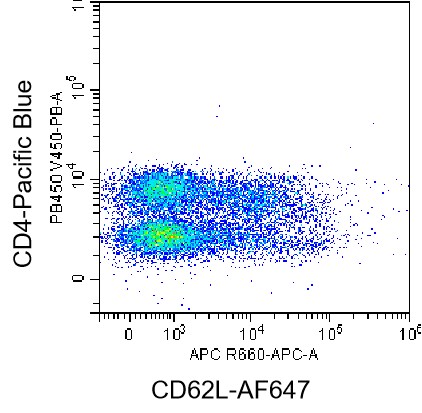• Staining of normal human peripheral blood mononuclear cells (PBMCs) using PB Anti-CD4 Antibody and AF647 Anti-Human CD62L Antibody (Clone: DREG-56) (Product No.: H0297). Analyzed data are derived from lymphocytes.