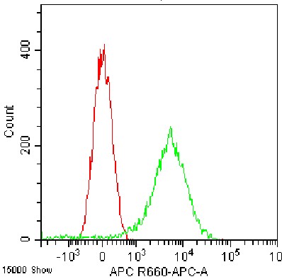 • Staining of platelet-enriched normal human peripheral blood using AF647 Anti-Human CD63 Antibody (Clone: H5C6) (Product No.: H1332) (green, red is blank control). Analyzed data are derived from lymphocytes.