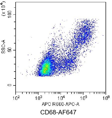 • Staining of fixed/permeabilized normal human peripheral blood mononuclear cells (PBMCs) using AF647 Anti-Human CD68 Antibody (Clone: Y1/82A) (Product No.: H0522). Analyzed data are derived from monocytes.